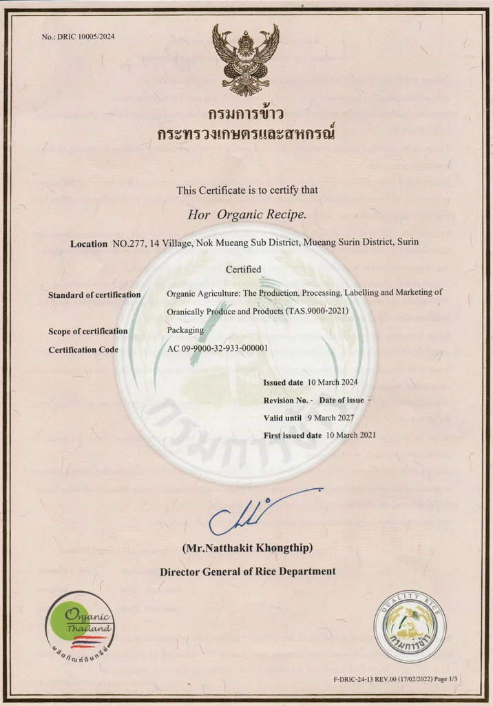 ผลิตภัณฑ์ "ข้าวเกษตรอินทรีย์สุรินทร์" ของเราได้รับมาตรฐานดังต่อไปนี้ (ขึ้นอยู่กับชนิดของข้าว)