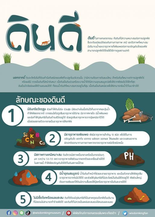 #ดินดี คือ ดินที่เพาะปลูกแล้วพืชงาม โตเร็ว ปลูกพืชหัวก็หัวใหญ่ ปลูกไม้ดอกก็ออกดอกดก ปลูกไม้ผลก็ผลดกน้ำหนักดี ดินแบบนี้มีลักษณะสำคัญ 5 อย่าง ลองมาดูกันว่าลักษณะ 5 อย่างของดินดีนั้นมีอะไรบ้าง